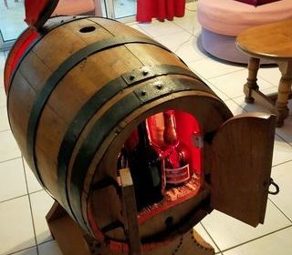 Beau tonneau bar bois massif Anneaux de cerclage métal Sur un socle Fabrication artisanale Avec 2 compartiments éclairés (rangement avant pour les bouteilles et rangement arriè