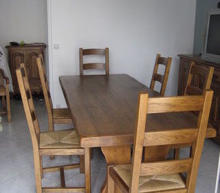 une table en chêne massif type "monastère" en très bon état dimensions: L = 220 cm ; l = 90 cm ; h = 76 cm Le plateau mesure 7 cm d'épaisseur 6 chaises en chêne massif A ve