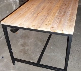 Table basse indus en sapin massif et métal. État : Neuf Plateau supérieur : Sapin Massif Finition : surface d'aspect rainuré, légèrement blanchie Structure & pieds : métal, pein