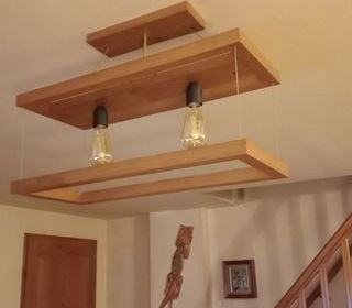 Lustre en chêne massif et câbles acier (2 douilles). Long 60 cm Larg 26 cm Hauteur sous plafond 42 cm (ampoules non fournies)