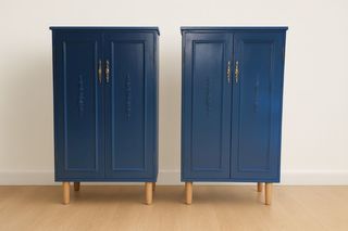 Je vends ces 2 commodes bleues en bois rénovées par mes soins (Décoratrice certifiée). - Type de produit : Commodes - Matériau : Bois MDF épais (20mm) - Couleur : Bleu foncé -