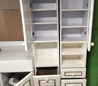 Meubles de salle de bain largeur 1,25 x 0,60 m en très bon état, bois massif peint blanc avec liserets marrons. Un meuble bas avec vasque et robinetterie Grôhe. 2 étagères avec por