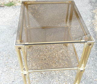 POST-MODERNISTE SPACE-AGE ceinture laiton Doré, deux plateaux verre Fumé Type: table basse Guéridon Forme: rectangulaire période:1970/78 style Jansen Moderniste Bauhaus S