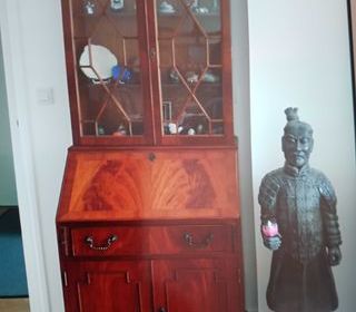Scriban en Acajou flamme de style anglais, vernis satiné. ( Fabrication unique de ce modèle. ) empattement maximum : prof: 410 mm. larg : 765 mm. haut : 1,93 m l'ensemble. à