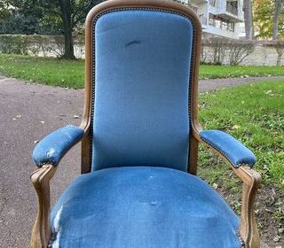 LIT-SOMMIER et 2 CHAISES assorties 2 personnes (vintage) : Tissu à restaurer - BOIS de lit en chêne 150 cm X 200 cm - SOMMIER à lattes "Bultex" adapté Couchage 140 cm X 190 cm