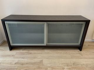 Buffet bas couleur wenge. Deux portes coulissantes en verre dépoli. Bon état malgré quelques marques d'usure peu visibles (voir les photos). Dimensions : 180cm x 80cm x 45cm