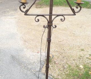 lampadaire en fer forgé, 5 feux, époque 1950/60, style haute époque, médiéval. Dimensions: 155 cm de haut x 53 cm ( caches douilles comprise). bon état general ,