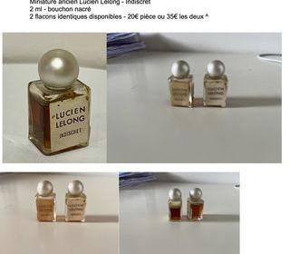 Vends deux miniatures de parfum ancien - Indiscret de Lucien Lelong 2 ml - bouchon nacré 2 exemplaires disponibles 20 € ou 35 € les deux