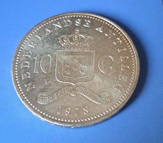 grande pièce de monnaie en argent des Antilles néerlandaises d'une valeur de 10 florins de l'année 1978, frappée pour la reine Juliana. De la circulation normale, mais toujours en