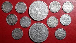 Royaume-Uni 1 lot de 12 monnaies argent 3 Pences 1891 /1900 / 1908 / 1913 / 1916 / 1920 / 1921 / 1922 / 1932 / 1933 . 1 florin Georges v 1930 1 florin Georges v 1936 port