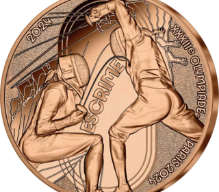 Avers de la monnaie L'escrime est représenté sur cette monnaie. Elle est une discipline emblématique des Jeux Olympiques, ayant une histoire remontant aux tout premiers jeux de