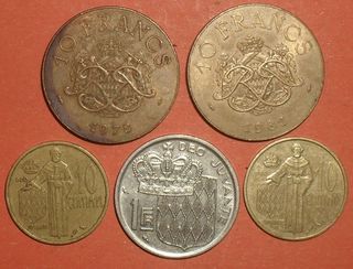 Lot de 5 pièces de Monaco. En bon état. Pièce de 10 Francs 1981. Pièce de 10 Francs 1978. Pièce de 1 Franc 1968. 2 Pièces de 10 Centimes 1962. D'autres lots de pièces de monn