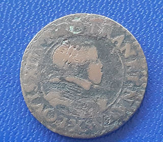 monnaie en bronze d'une valeur d'un double tournois de l'an 1614 X, frappée pour le roi Louis XIII à Amiens. De la circulation normale, mais toujours en bon état et clairement lisi