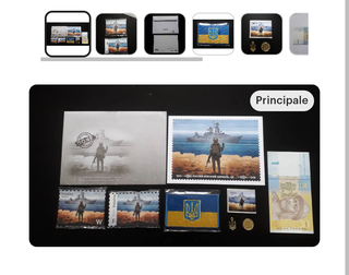 Lot comprenant : Une carte postale Une enveloppe Deux aimants de frigo Un billet Une pièce de monnaie Une breloque Trident Un sticker Un patch militaire velcro Le t
