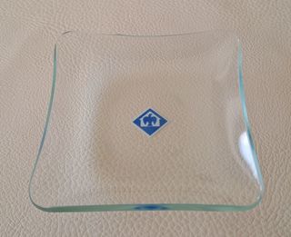 ancien ramasse monnaie incurvé coupelle vintage en verre logo maisons phénix années 70 80 pas de rayure ou ébréchure, petites traces de frottement sur le verso 9x9 cm