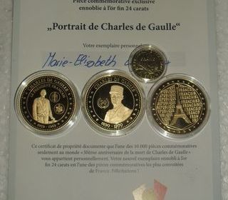 4 Pièces de collection dorées à l'Or fin 24 carats Compagnie Française des Monnaies et Médailles. Pièces commémoratives ennoblies à l'OR fin 24 carats. Métal cupronickel doré à