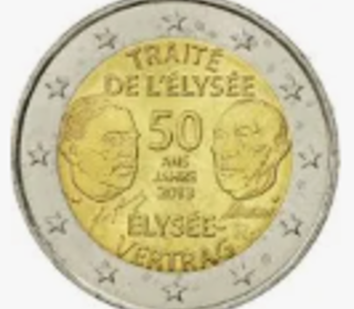 Pièce de monnaie commémorative de 2 euros émise en 2013, comportant deux portraits en profil et l'inscription "Traité de l'Élysée 50 ans 1963, Élysée-Vertrag". La pièce présente ég