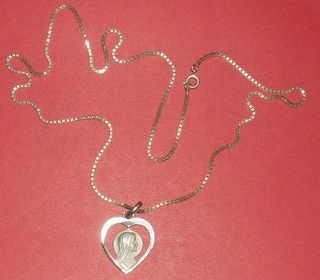 Médaille Vierge dans un c?ur argenté. En très bon état. Dimensions: -Médaille: Longueur 2cm et hauteur 2,3cm. -Chaîne: Longueur 49cm. D'autres lots de bijoux sur ce site, n'hé