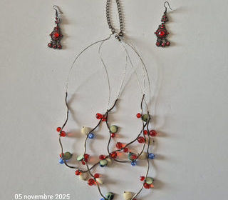 Collier fantaisie en perles de verre et argent et 2 boucles d'oreilles Les boucles sont en verres et métal ...Le collier porte des tubes d'argent ( à