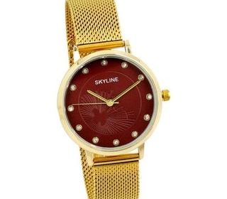 Montre Skyline femme, boitier doré fond rouge, et son bracelet maille milanaise acier inoxydable de couleur or, étanche, + boite Caractéristiques du produit marque Skyline