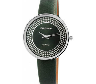 montre femme fond vert et trass argenté, bracelet cuir synthétique de couleur vert marque excellanc boitier métal argenté brillant de 34 mm de diamètre, et de 8 mm d'épaisse