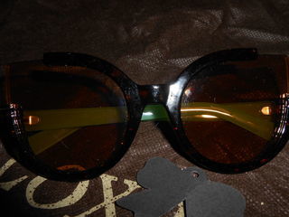 lunette solaire femme, plexiglas de qualité, prototype état neuf modèle verres brun, monture écaille de tortue, branches vert pomme, très chic protection UV 2, longueur 14 cm, la