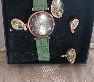 Magnifique ensemble bijoux montre cadrant rose bracelet vert sauge Neuf sans étiquette. État Neuf sans étiquette Matière Cuir synthétique, Acier Couleur Vert, Rose.