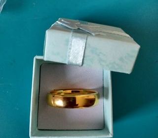 Alliance plaquée or 18 carats. Neuve encore dans emballage d'origine avec écrin. Commande sur internet mais trop petite. Taille 13 US. Équivalent à 54 baguier. Bonne affaire