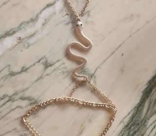 Je vends ce bracelet serpent en plaqué or État neuf. Serpent sur la main, chaîne entourent le doigt chaîne poignet réglable N'hésitez pas à me contacter pour plus d'informat