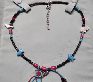 Orné de petites breloques et de couleur intemporel très joli collier en parfait état ! Remise en main propre et règlement en espèces.