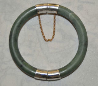 frais d'envoi en supplément Bracelet jonc en jade. Une réparation a été faite sur la droite (la flêche sur la photo). Sinon le fermoir fonctionne sans problème, chainette intact