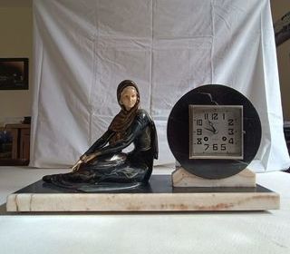 Pendule Art-Deco marbre, régule et ivoirine sujet femme, larg. 50 cm