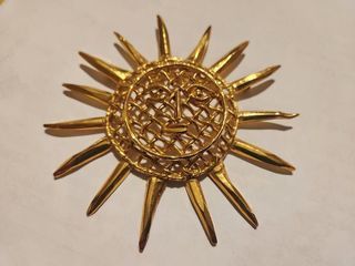 Vends Broche Soleil rayonnant doré Siglé Christian LACROIX Dim largeur 10.5 x longueur 10.5 cm env. Vintage année 90 Rayons très pointu, en métal doré.. Bon état, la branch