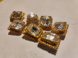 Vends Lot de 7 Boutons rectangle doré strass crystal Pas de sigle, mais très probablement ANTIGONA Dim 14 x 17 mm env, epaisseur 8 mm avec le strass, + anneau. vintage année 9