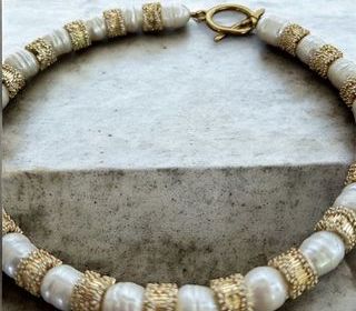 collier ras du cou perles de culture naturelle et anneaux en acier inoxydable dorée à l'or fin avec strass de zirconium Fermoir OT en acier inoxydable doré neuf jamais porté n