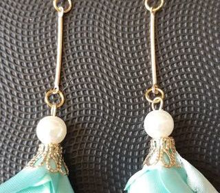 Paire de boucles d'oreilles danseuses pour oreille percée faites main rose en satin bleu turquoise avec une perle blanche montées sur une tige dorée le fermoir doré est hypoaller