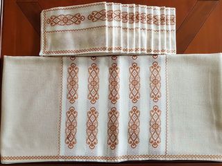 Service de table 12 couverts en polyester, écru avec motifs brodés Nappe rectangulaire : 145cm x 270cm 12 serviettes assorties : 47cm x 47cm Très belle qualité. Lavable en machi