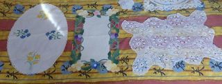 NAPPERONS (D) : - 1 rectangulaire 56.5x33.5 cm - 1 rectangulaire tissu couleur 44x28.5 cm - 1 oval tissu - brodé fleurs - contour dentelle 50x36 cm à l'unité ou en LOT