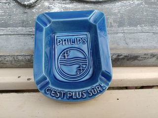 Ancien Cendrier Publicitaire en Faïence Philips C'est Plus Sur ! Hauteur 12,5cm, largeur 10cm, épaisseur 3cm. Bon état, petits accidents sur le bord.