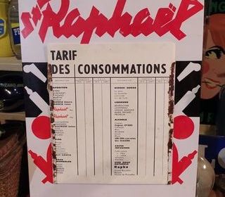 Ancienne Plaque Tôle Publicitaire Tarifs des Consommations St Raphaël Quinquina Hauteur 40cm, largeur 30cm. Bon état, oxydation au niveau de la glissière.