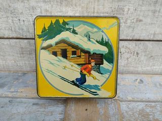 Ancienne Boite Tôle Publicitaire Biscuits Brun Montagne Ski Skieur Cotés 15cm, hauteur 6cm Bon état, légères déformations.
