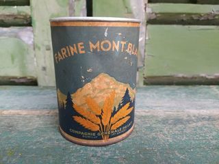 Ancienne Boite Publicitaire Farine Mont-Blanc Compagnie Générale du Lait Rumilly (Hte Savoie) Hauteur 12cm, diamètre 9cm. Bon état.