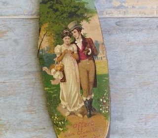 Ancien Chromo Publicitaire Rehaussé à la peinture "Offert a sa clientèle, Mme Vaudou, Corsets, 24. R. Nationale, Tours Hauteur 27cm, largeur 9cm, épaisseur 1cm Bon état