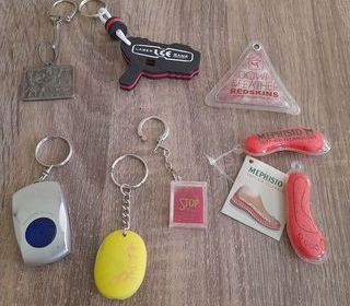 Lot de porte-clés publicitaires et autres, - porte-clés forme pistolet, en mousse, Laser Game, - porte clés Méphisto x 2 - porte-clés Redskins, - porte-clés lumineux argenté,