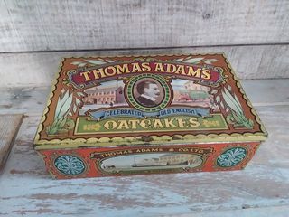 Ancienne Boite Tôle Publicitaire Biscuits Oatcakes Thomas Adam's Longueur 25,5cm, largeur 7,5cm, hauteur 8cm Très bon état, légère usure et déformations.