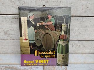 Glacoide Thermomètre Publicitaire Muscadet André Vinet Vallet Hauteur 29cm, largeur 24cm État, présence d'usure, une retouche à la peinture au niveau du bras de l'homme Ca