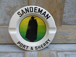 Ancien Cendrier Publicitaire Sandman Port and Sherry Faïence de Sarreguemines Diamètre 15cm, hauteur 2cm Bon état, légère coloration et fêle sur le fond