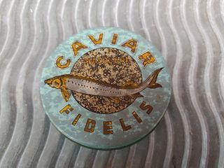 Ancienne Boite Publicitaire Caviar Fidelis Malassol New-York Diamètre 10cm, hauteur 2,3cm. Bon état, légère usure