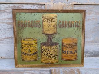 Plaque Tôle Publicitaire Rare !! Graisse Étoile, Égyptienne, La Victoria, Mika Collection Cirage Garage Plaque bombée et en relief Longueur 29,5cm, hauteur 24cm État : B