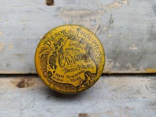 Rare Boite Tôle Publicitaire Le Trésor du Troupier Tours Cavaliers 14-18 WW1 Boite d'onguent Spéciale pour les Cavaliers , Docteur P. Augis aux Halles à Tours Diamètre 4,5cm,